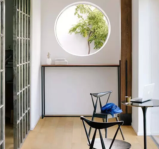 公共辦公區(qū)相對(duì)而言顯得比較擠,光線也不是很好,所以設(shè)計(jì)師在走廊的部分利用江南園林式的圓窗引入室外光線和綠意,讓整個(gè)空間不顯得逼仄,反而有種眼前一亮的小心思。