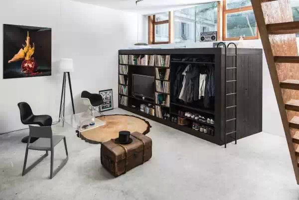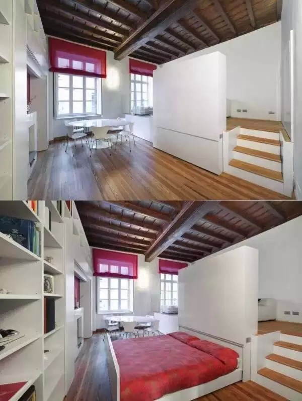 在這個(gè)狹窄的空間你能找到床、儲(chǔ)物柜、掛衣區(qū),這樣的布局高效的利用了窗邊空間。配上了經(jīng)典家居:S型椅、伊姆斯餐椅,更顯現(xiàn)代又創(chuàng)意。