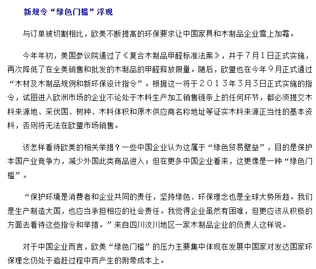 最日,歐盟確定了“木材及木制品規(guī)例和新環(huán)保設(shè)計(jì)指令”會(huì)在明年3月實(shí)施,要求進(jìn)口到歐盟市場(chǎng)的木制品必須獲得森林管理委員會(huì)(FSC)的認(rèn)證,新規(guī)執(zhí)行對(duì)中國(guó)家具出口企業(yè)而言,是挑戰(zhàn)也是機(jī)遇。正規(guī)的品牌和廠家認(rèn)為,實(shí)施中國(guó)政策是抬高了行業(yè)的門檻,通過(guò)淘汰不正規(guī)的企業(yè)來(lái)促進(jìn)規(guī)范的企業(yè)。但也有很多人認(rèn)為,這個(gè)政策會(huì)使成產(chǎn)的家具價(jià)格變高,因?yàn)檎J(rèn)證FSC森林的供應(yīng)商會(huì)減少,供不應(yīng)求使原材料價(jià)格變高,這會(huì)使得剛剛起步的家具企業(yè)面臨倒閉的現(xiàn)狀,也會(huì)使得很多家具公司退出歐洲市場(chǎng),這也會(huì)面臨有不少人失業(yè),產(chǎn)生失業(yè)現(xiàn)況。