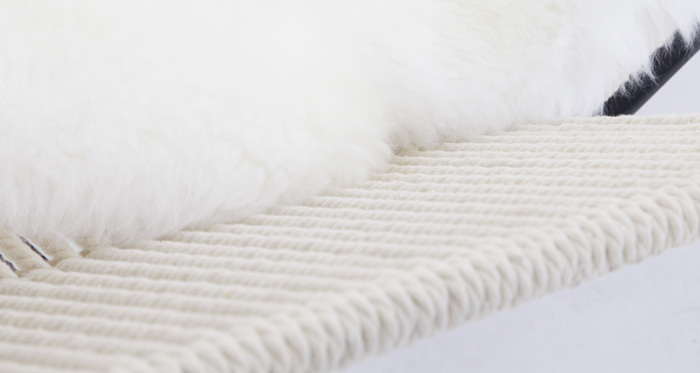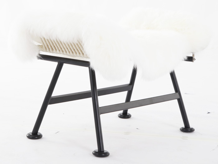 黑色烤漆腳,不銹鋼架,黃牛皮頭枕,墊子為羊毛皮。 |
